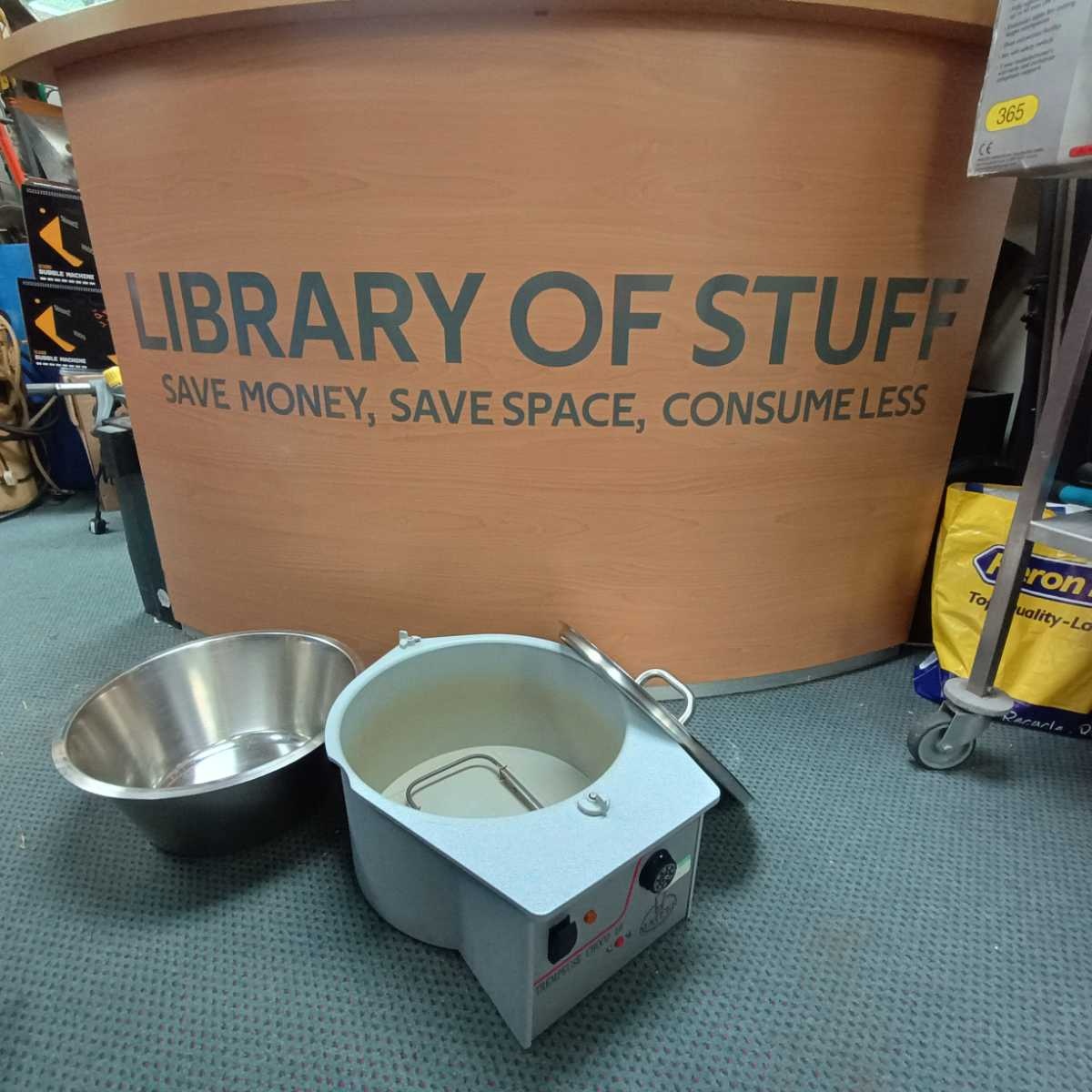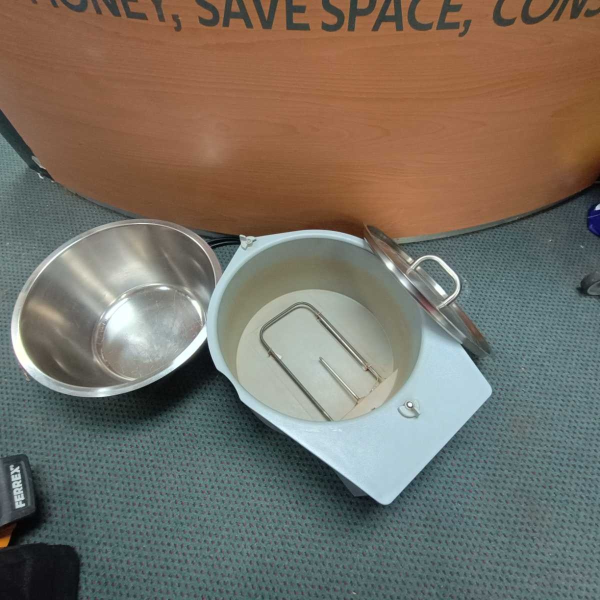 Compact bain marie style chocolate dipping machine to make chocolate coated candies.