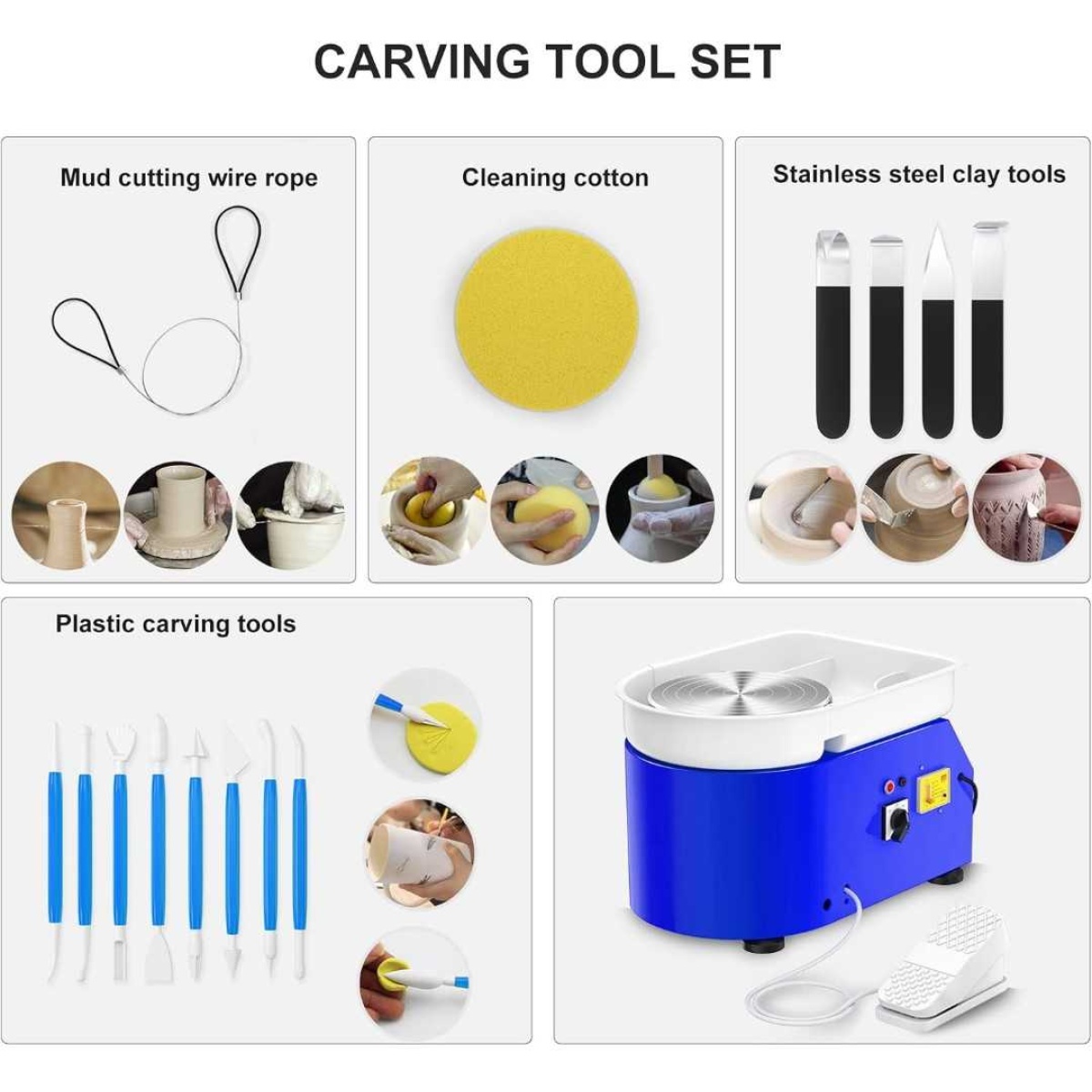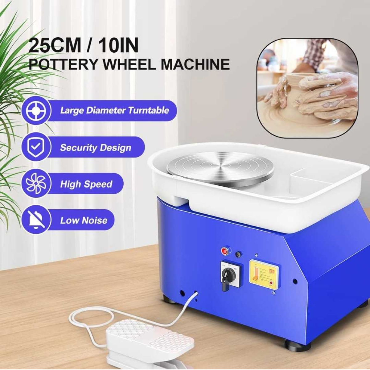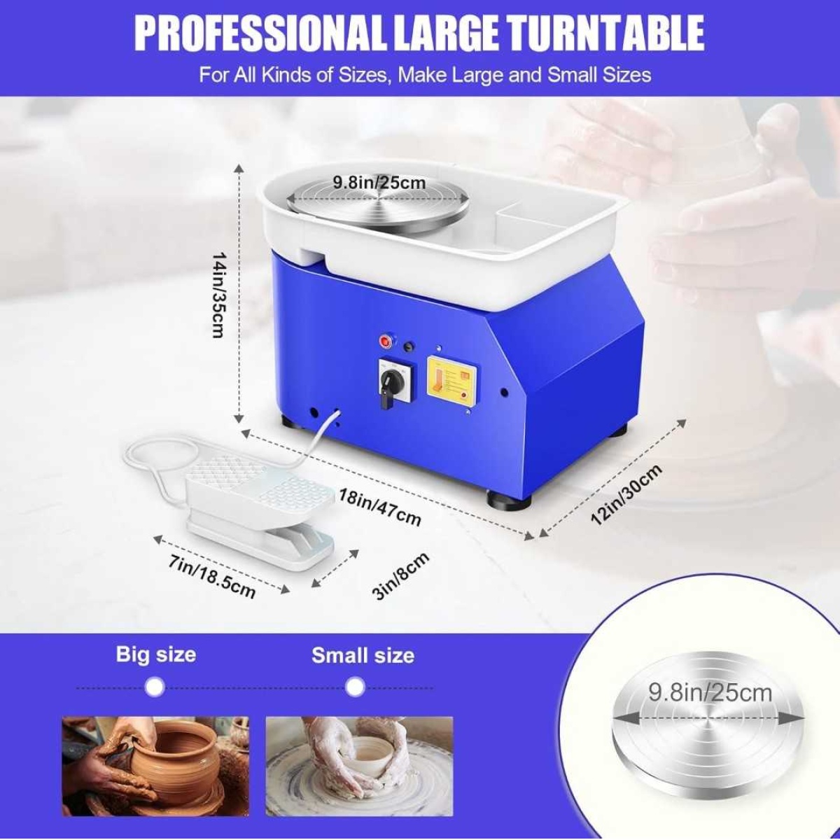 Features a 25cm (9.8") aluminum alloy wheel suitable for creating larger pieces. Includes foot pedal for variable speed control (0-300 rpm) and reversible rotation direction.