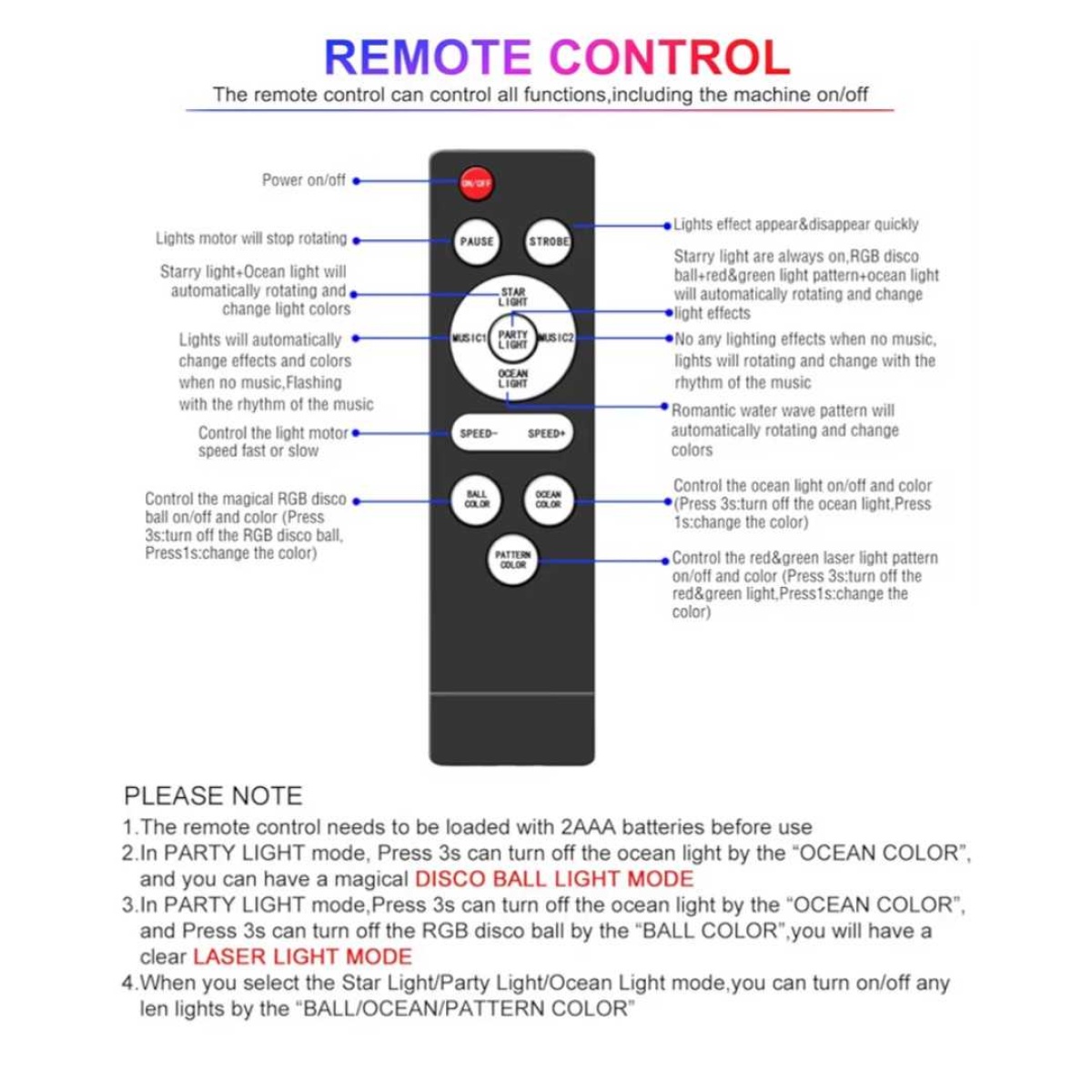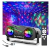 Projects various lighting effects including disco ball, stars, ocean waves, and coloured patterns onto walls and ceilings. Features multiple scene modes that can be selected individually or combined.